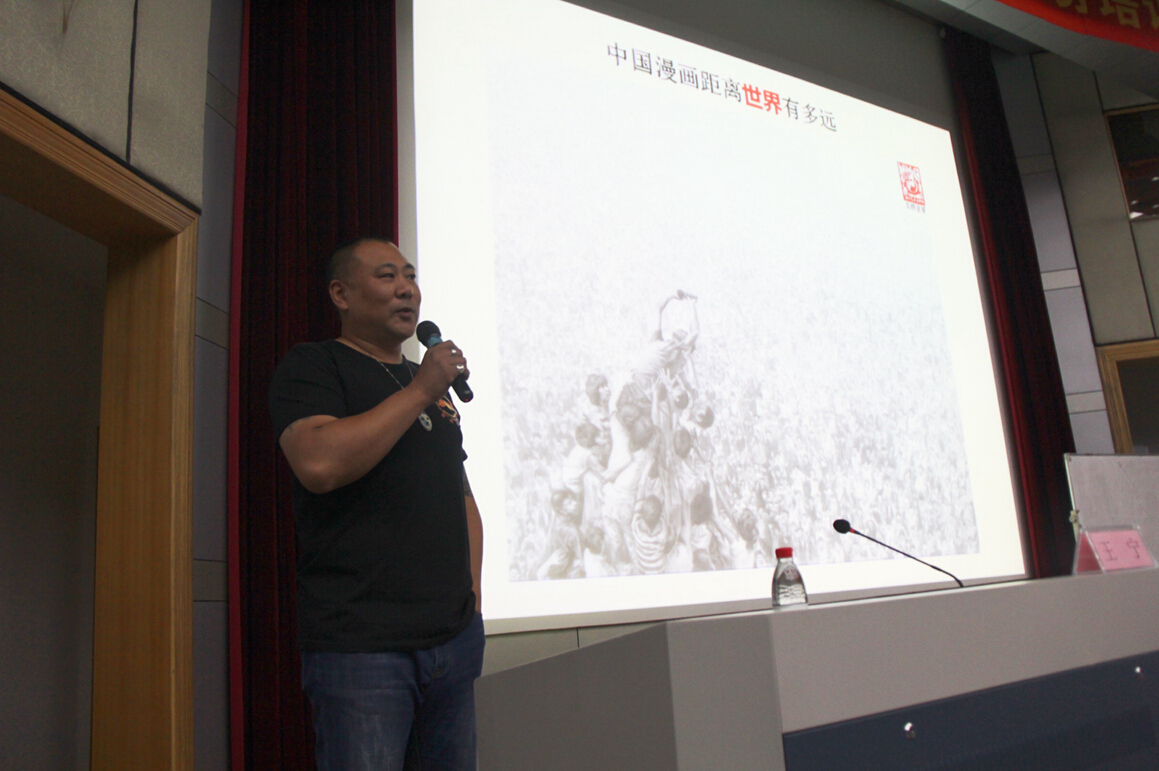 此次培訓(xùn)壓軸講座是由北京天視全景文化傳播有限責(zé)任公司總經(jīng)理王寧帶來的《中國漫畫離世界有多遠(yuǎn)》。王寧先生以幽默風(fēng)趣卻不失大雅的演講風(fēng)格在講座一開始便獲得陣陣掌聲。王寧曾是著名動(dòng)畫人,曾參與家喻戶曉的《海爾兄弟》等動(dòng)畫片的制作,之后投身漫畫界,現(xiàn)致力于優(yōu)秀漫畫“走出去”并引進(jìn)海外優(yōu)秀動(dòng)漫作品。他先是詳細(xì)介紹各個(gè)漫畫的種類,普及在座人員對漫畫的知識,掃除大家對漫畫的盲區(qū)。再按地區(qū)對日本漫畫、美漫與歐洲漫畫這三個(gè)世界上最具影響力的漫畫種類,針對其風(fēng)格,受眾群體,代表性作品與漫畫家,進(jìn)行了比較分析,并且提到了中國漫畫對他們的產(chǎn)生的積極的影響。不過,王寧先生也直言中國漫畫單一的創(chuàng)作形式,受眾群體較為落后的觀念,使得中國漫畫在樹立自身特色還有很長一段路要走。同時(shí)他坦言什么都能快,但是文化藝術(shù)創(chuàng)作是最快不得。無論是立足本國市場還是“走出去”,必須以一絲不茍的態(tài)度面對市場,面對讀者,做出高質(zhì)量的作品。臨近講座尾聲,王寧先生還簡單分享了漫畫編輯在“走出去”中的角色以及內(nèi)容。