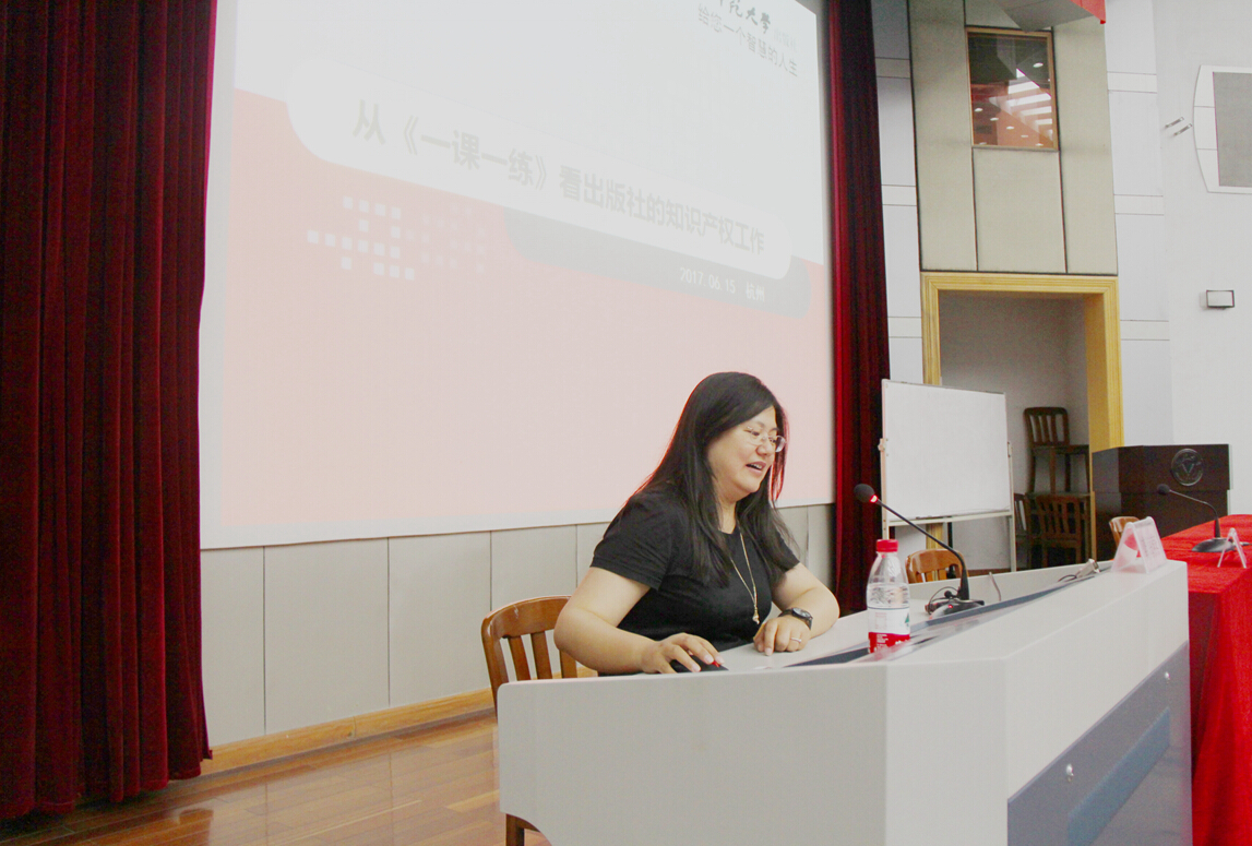下午第一場講座是由華東師范大學(xué)出版社龔曉燕副社長帶來的《從“一課一練”看出版社的知識產(chǎn)權(quán)工作》。龔曉燕副社長先是簡單介紹了華東師范大學(xué)出版社歷史,使命與其在業(yè)界獲得成功的秘訣。接著就“一課一練”教輔走出國門案例轟動(dòng)全國分享成功經(jīng)驗(yàn)。她將這次成功歸結(jié)為五個(gè)步驟:打造品牌、抓住契機(jī)、創(chuàng)新思考、主動(dòng)出擊,最后實(shí)現(xiàn)突破。并且每個(gè)環(huán)節(jié)都具體例子具體分析,暢談如何把握海外差異與建立自身特色。最后龔社長在知識產(chǎn)權(quán)角度,分享在知識經(jīng)濟(jì)中如何運(yùn)營與管理自身的版權(quán)。