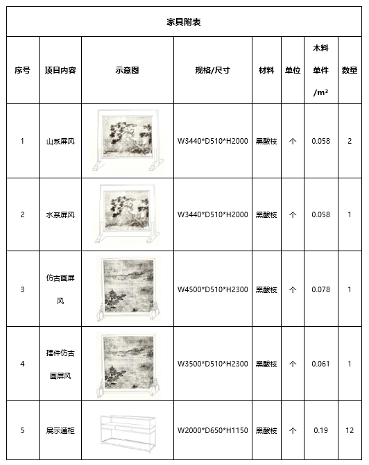 (3)屏風(fēng)、通柜等采用中國(guó)古法傳統(tǒng)工藝且仿宋款式,家具示意圖僅供參考,細(xì)節(jié)內(nèi)容由各供應(yīng)商自行進(jìn)行深化設(shè)計(jì)。清單如下: