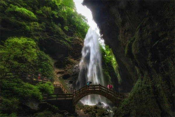 龍水峽地縫,則是大地深藏于懷中的神秘裂痕。沿著棧道緩緩下行,兩側(cè)絕壁陡峭如削,飛瀑如練,從崖頂傾瀉而下,水花飛濺,似銀珠落玉盤,在陽光的折射下,幻化成七彩霓虹。谷底幽深得仿佛通向地心,每一步都似在探秘未知的世界,心跳與腳步聲交織,奏響一曲冒險的旋律。