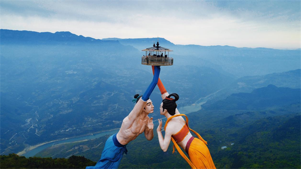 作為全球唯一以愛情為主題的“飛天之吻”,成為白馬山必游景點(diǎn)之一。它由兩臺(tái)大型的飛行島組成,南邊的飛島代表白馬王子,北邊的飛島代表仙女。當(dāng)你坐進(jìn)觀光艙,飛行島緩緩旋轉(zhuǎn)上升,升至52米高空時(shí),兩臺(tái)飛行島會(huì)聯(lián)動(dòng)運(yùn)行,最終在高空定格“接吻” 。此時(shí),腳下是1314米的烏江垂直落差,眼前是遼闊的自然風(fēng)光,刺激與浪漫并存,絕對(duì)是不容錯(cuò)過(guò)的打卡體驗(yàn)。