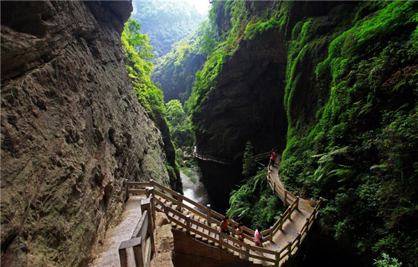 龍水峽地縫位于白果鎮(zhèn),是一座典型的喀斯特巖溶峽谷,和天生三橋一樣,乘坐80米的高空游覽電梯下至谷底,漫步谷底,猶如置身時空隧道,只見溪水潺潺,碧潭幽深。地下水從200多米的崖壁飛流至谷底,撞擊在谷底石壁上,站在谷底,呼吸著負氧離子極高的空氣,聽著流水聲,美妙!如果把天生三橋比作大家閨秀,那把龍水峽地縫比作小家碧玉一點不為過。