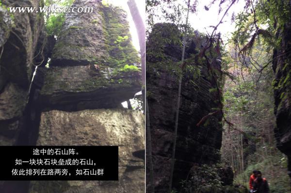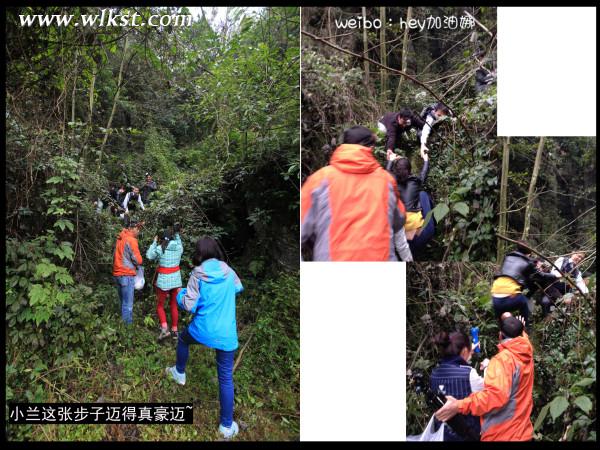 一塊大石擋在我們面前,因無(wú)人到此,石上覆蓋青苔。隱藏在青苔下面,是大石一層層突出的紋理。紋理鋒利尖銳。由于石頭過高,只得平哥及小馬哥先行爬上去后,再拉我們上去。