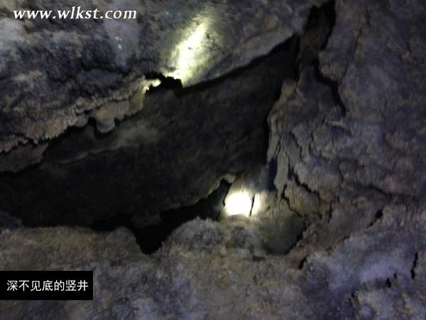 ”這邊就有個(gè)哈,大家注意哦!“在我們剛爬上的洞口旁,便有一個(gè)深不見底的豎井。