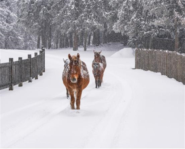 仙女山的雪,有北國(guó)的豪邁,也有南國(guó)的柔情。草原與山巒相接的雪景,美翻了這個(gè)季節(jié)的每個(gè)角落,鋪滿(mǎn)白雪的草原,盡展千里的蒼茫。雪花飛舞于山巒、林間,馬兒在雪中悠然行走,仿佛一張張?zhí)烊凰?huà),美不勝收。
