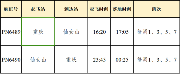 據(jù)了解,該航線由南方航空?qǐng)?zhí)飛,機(jī)型為空客A320。每周計(jì)劃執(zhí)行3班,班期為周二、周四、周六,航班號(hào)為CZ8571和CZ8572。航班CZ8571于 8:30從北京大興國(guó)際機(jī)場(chǎng)起飛,11:40抵達(dá)重慶武隆仙女山機(jī)場(chǎng);航班CZ8572于12:35從重慶武隆仙女山機(jī)場(chǎng)起飛,15:00抵達(dá)北京大興國(guó)際機(jī)場(chǎng)。