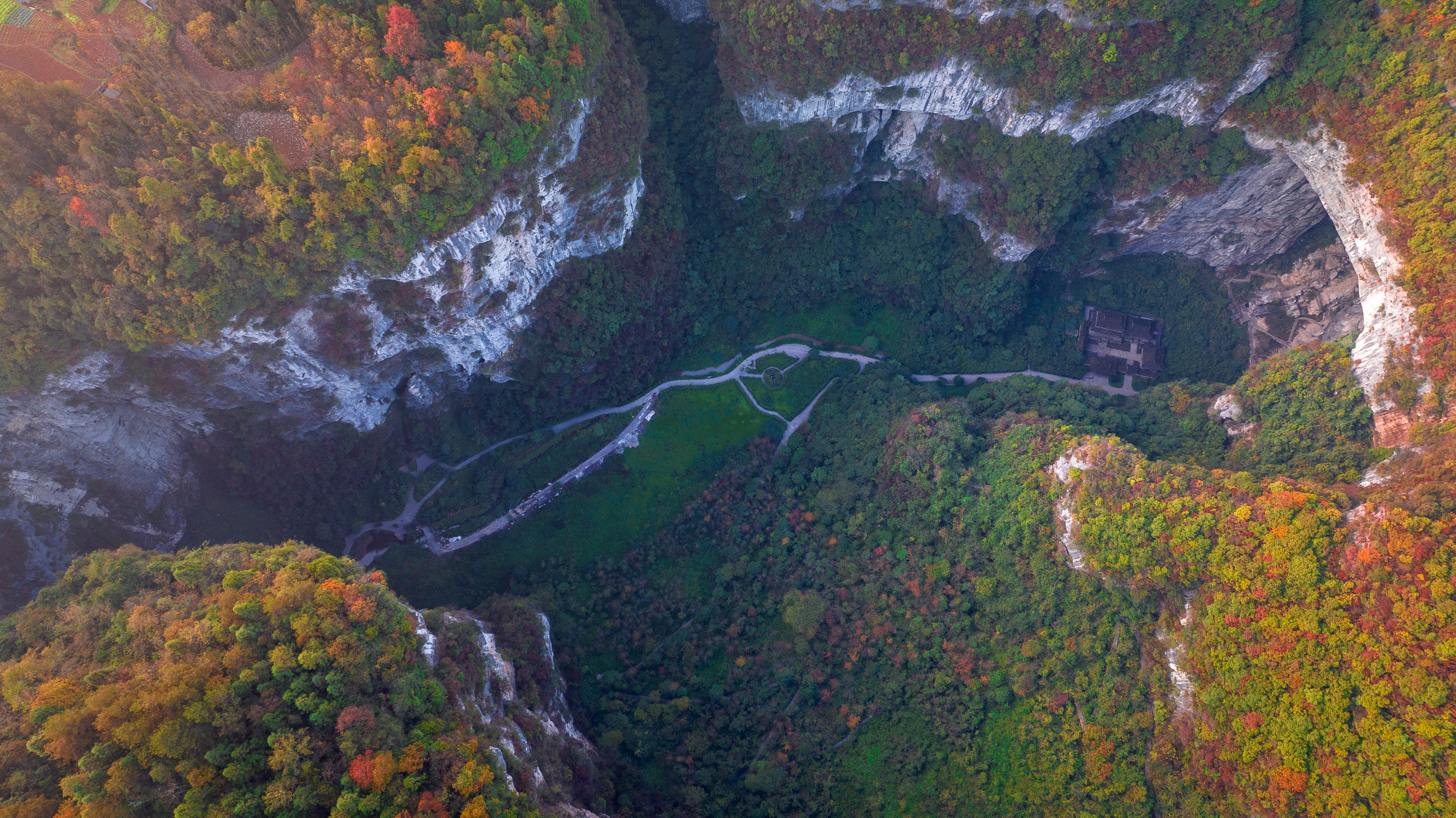 褪去夏日悶熱,此時(shí)正是探秘喀斯特奇觀的好時(shí)節(jié)。步道兩旁,青灰?guī)r壁與橙紅灌木相映成趣。秋風(fēng)穿過橋洞,與谷底溪流合奏“秋日交響樂”。