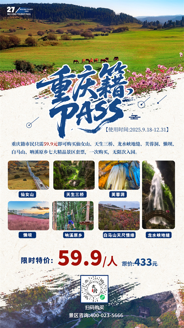 武隆特別推出“重慶籍Pass”,僅需59.9元,即可無(wú)限次游覽仙女山、天生三橋、龍水峽地縫、芙蓉洞、懶壩、白馬山、吶溪原鄉(xiāng)七大景區(qū)(單日單個(gè)景點(diǎn)限一次)。一票在手,輕松解鎖武隆醉美秋色。