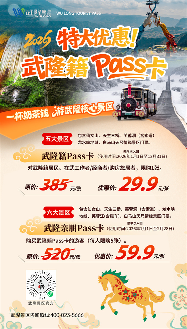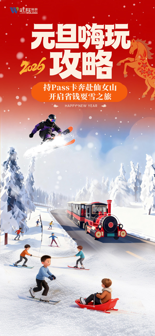 新年伊始,武隆張開熱情懷抱,誠(chéng)邀八方游客元旦來賞景玩雪!持2026年旅游通行Pass卡,暢享超多福利。元旦的武隆,美景如畫,優(yōu)惠似潮,等您共赴精彩之旅,一起開啟歡樂新年!