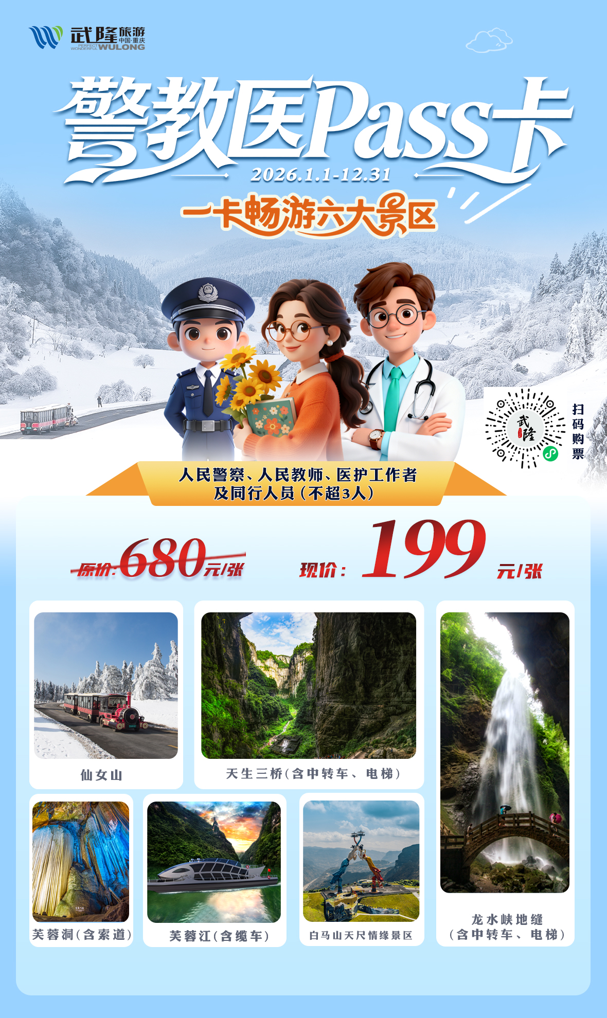 除了針對人民警察的免票政策外,武隆景區(qū)還特別推出“警教醫(yī)Pass卡”,為警察、教師、醫(yī)護工作者及其同行人員提供超值優(yōu)惠: