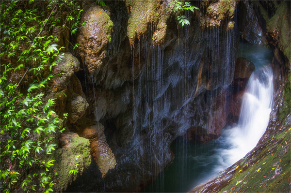 “世界奇觀”天生三橋,三橋夾兩坑、雄奇險秀,鬼斧神工。抬頭望,壁立千仞,橋體溶洞四伏,水簾高懸;低頭看,橋下溪流潺潺,噴泉叮咚。