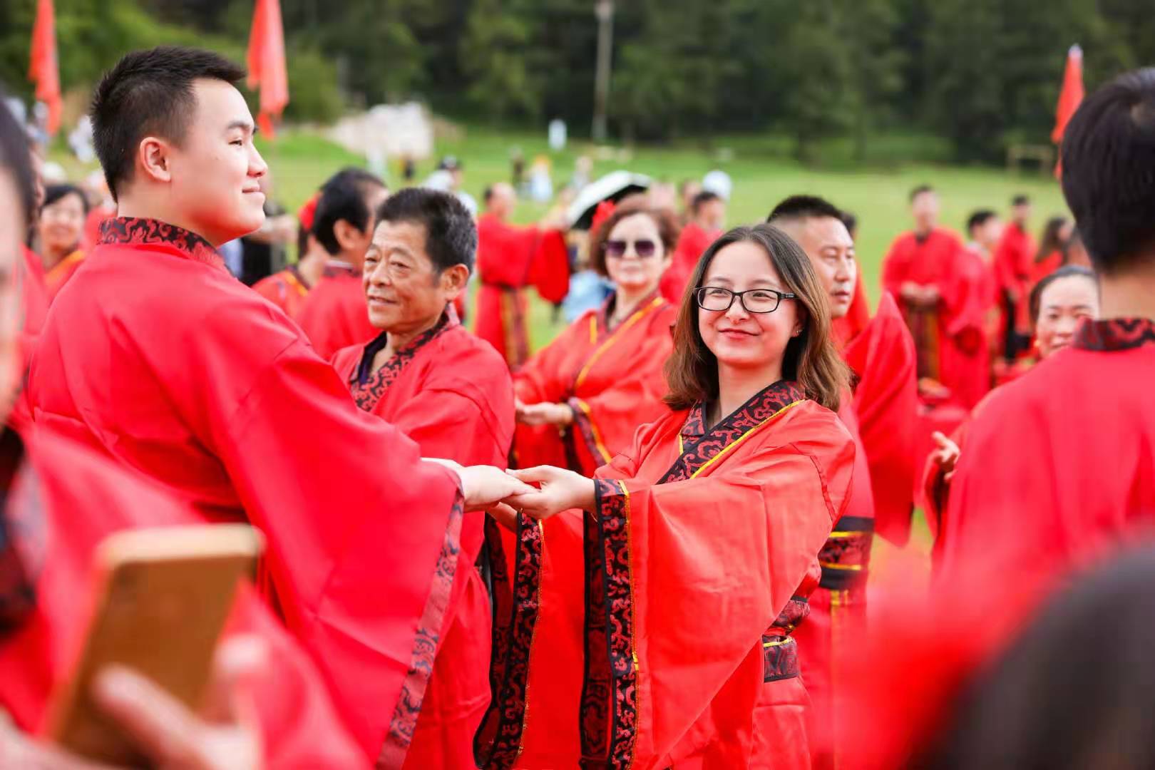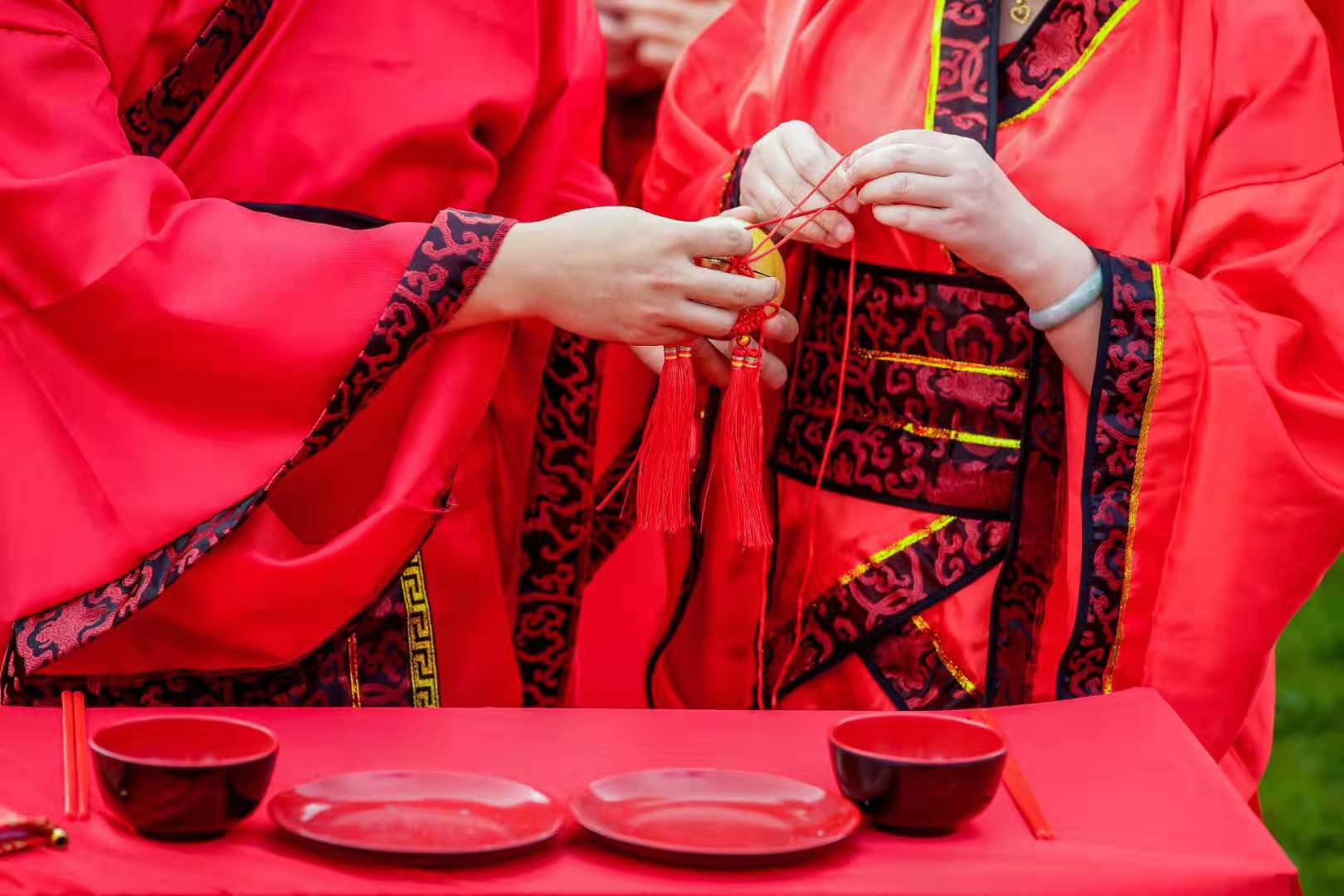 此次集體婚禮,以《周禮》為藍(lán)本,在《儀禮·仕婚禮》《禮記·昏義》所記載禮儀規(guī)制基礎(chǔ)上,結(jié)合了當(dāng)代審美進(jìn)行打造?;槎Y現(xiàn)場紅毯鋪地、紅綢覆案、漢旗飄揚,幾案上整齊地擺放著漆碗、匏瓜等古典器具,原汁原味地再現(xiàn)了具有漢民族傳統(tǒng)特色的漢式婚禮儀式。