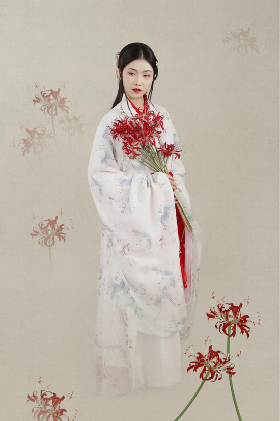 這套服飾靈感來源于靈魂擺渡神話作品故事,色調(diào)用飄逸仙氣的仙鶴白色底紋,和鮮紅的彼岸花形成對比,駱虹宇演繹出縹緲仙氣之感。袖口里的紅色,作為點睛之筆使人物主題更加素凈,如圖唯美古典的畫中人。