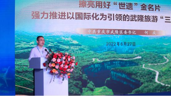 在本次會議上,武隆區(qū)委書記何慶作了主題為《擦亮用好“世遺”金名片 強力推進以國際化為引領(lǐng)的武隆旅游“三次創(chuàng)業(yè)”》的專題報告。報告中,一組組數(shù)據(jù)、一個個案例,彰顯著武隆旅游高質(zhì)量發(fā)展取得的成果,以及武隆旅游開啟“三次創(chuàng)業(yè)”的豪邁步伐。