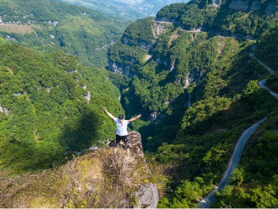 登上頂部,站在懸崖之巔,一覽眾山小。低頭腳下便是溝壑分明的黃鶯大峽谷,抬頭便可見遠處的山脈和蔚藍的天空。膽大的男同胞坐在懸崖巨石前端,一條腿甚至伸出懸空,直叫人看的膽戰(zhàn)心驚。