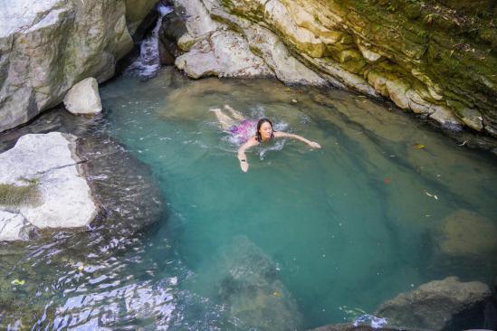 深潭處水質(zhì)清澈見底,不時可見小魚穿梭其間。喜歡游泳的美女早就迫不及待跳入深潭,在清泉中自由暢快游泳。