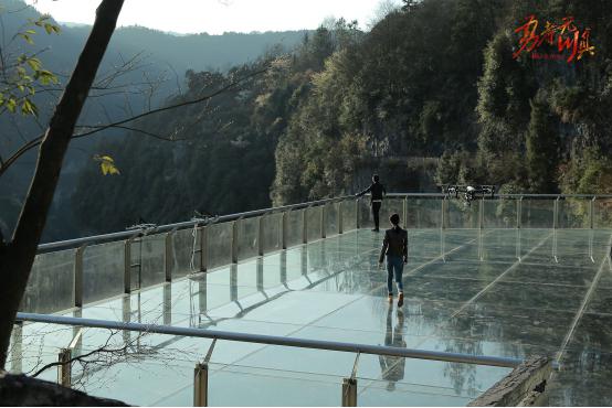 以喀斯特地貌為主的武隆景區(qū),非常適合警匪題材電視劇,成為《勇者無懼》拍攝武打戲的最佳場景。路透照中,劇組在武隆天生三橋玻璃眺臺進行拍攝,演員高空騰空翻反身從懸崖跳下,畫面驚險刺激。
