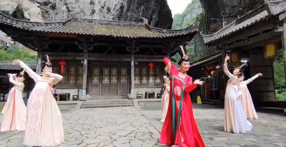 作為《滿城盡帶黃金甲》的外景拍攝地,天福驛站被天龍橋萬丈深淵所籠罩,四周巖石崢嶸。別致的漢服造型古樸典雅的建筑交相輝映,組成一場極具古韻的視覺盛宴。裊裊仙音起,佳人迎風(fēng)舞,瞬間將游客拉回那個古老悠遠年代。衣袂輕舞,步履蹁躚,吸引不少游客駐足拍照。