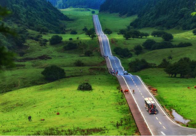 行走在仙女山最美公路上,高低起伏的公路向遠方延綿,最后消失在盡頭。道路兩旁則是綠草茵茵,與悠閑行走、吃草的牛馬共同形成一幅愜意溫馨的畫面。