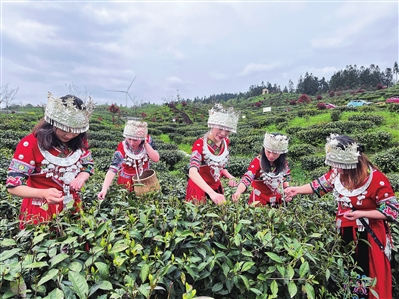 在龍神坳高山茶種植基地,放眼望去,翠綠的茶壟層層疊疊,漫山茶樹(shù)爭(zhēng)相吐出新芽,空氣中四處彌漫著茶葉和泥土的芬芳。在采茶體驗(yàn)區(qū),游客們身穿苗族土家族服飾,紛紛化身阿哥阿妹,分散在茶壟間,采摘今年第一茬春茶嫩芽,體驗(yàn)別具一格的采茶樂(lè)趣。