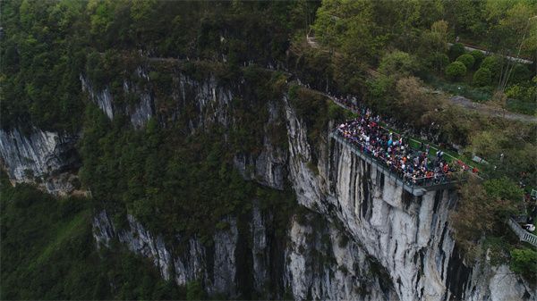 盡管天空淅淅瀝瀝地下著小雨,不過大家熱興致絲毫不受影響。許多人不顧地面的濕滑,躺在玻璃臺(tái)上拍照留念。“站在上面非常刺激,還可以遠(yuǎn)遠(yuǎn)的看到對(duì)面的天生三橋喀斯特地貌,太棒了!”來自臺(tái)灣帝寶假期旅行社的李先生表示。