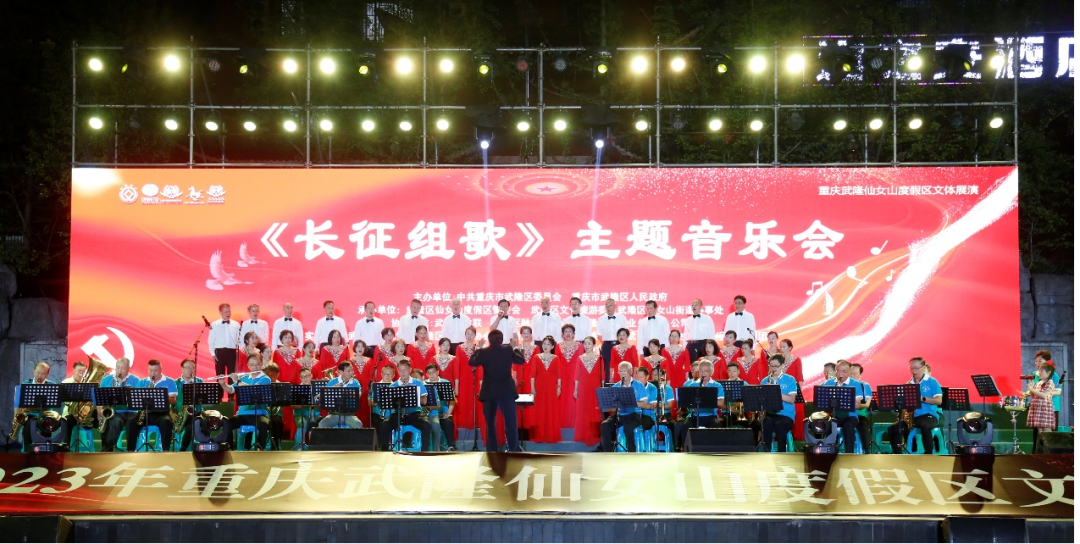 隨著武隆區(qū)慶祝建黨102周年《長征組歌》主題音樂會管樂合奏《亮劍組曲-中國軍魂》的奏響,2023重慶市武隆區(qū)仙女山度假區(qū)文體展演系列活動正式拉開序幕?;顒佑芍泄仓貞c市武隆區(qū)委員會、重慶市武隆區(qū)人民政府主辦,區(qū)委宣傳部、區(qū)文化旅游委、仙女山旅游度假區(qū)管委會、仙女山街道承辦,區(qū)文聯(lián)、區(qū)融媒體中心、旅產(chǎn)(集團(tuán))公司協(xié)辦,區(qū)文化館、區(qū)音樂家協(xié)會、仙女山街道文旅中心、區(qū)印象文化公司(區(qū)歌舞劇院)具體實施,從8月11日開始一直持續(xù)到8月20日。