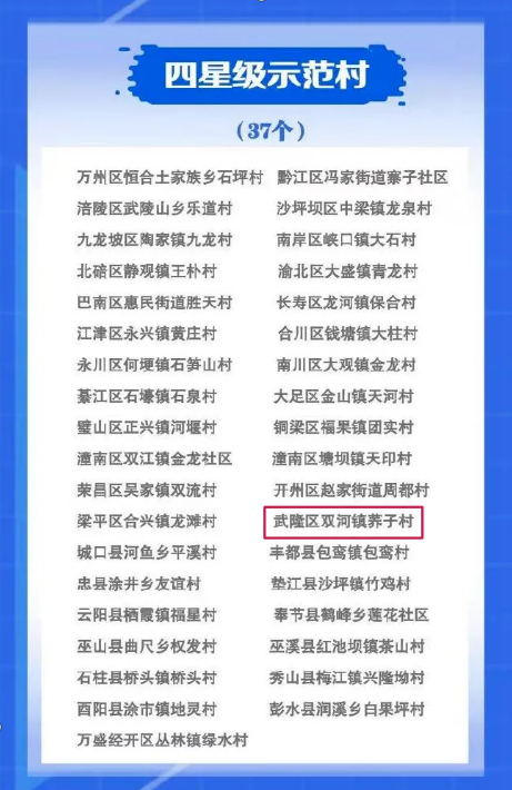 近日,重慶市農(nóng)業(yè)農(nóng)村委(重慶市鄉(xiāng)村振興局)公布2023年度巴渝和美鄉(xiāng)村示范村創(chuàng)建結(jié)果,107個村(涉農(nóng)社區(qū))成功創(chuàng)建巴渝和美鄉(xiāng)村示范村,包含五星級示范村43個、四星級示范村37個、三星級示范村27個。其中,仙女山街道荊竹村獲評五星級示范村,雙河鎮(zhèn)蕎子村獲評四星級示范村,滄溝鄉(xiāng)大田村獲評三星級示范村。
