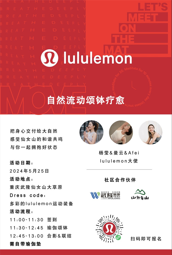 在這個(gè)繁忙的都市生活中,每個(gè)人都渴望找到一片屬于自己的寧?kù)o之地。5月25日,仙女山將變身瑜伽愛(ài)好者的天堂!200名瑜伽達(dá)人將與頂流運(yùn)動(dòng)品牌lululemon攜手,在仙女山這片天然氧吧中,開(kāi)啟一場(chǎng)別開(kāi)生面的自然運(yùn)動(dòng)之旅。這不僅是一次身心的放松,更是一次與大自然親密接觸的絕佳機(jī)會(huì)。