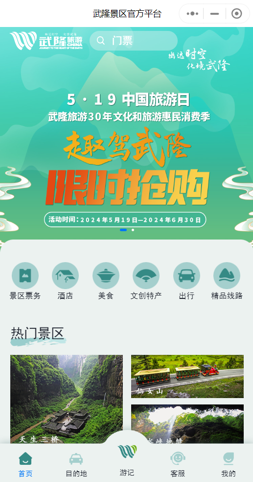 在武隆景區(qū)官方平臺,你可以享受“吃住行游購娛”全方位服務,還等什么?一鍵進入“武隆景區(qū)官方平臺”,加入惠民消費活動,一起暢游武隆吧!