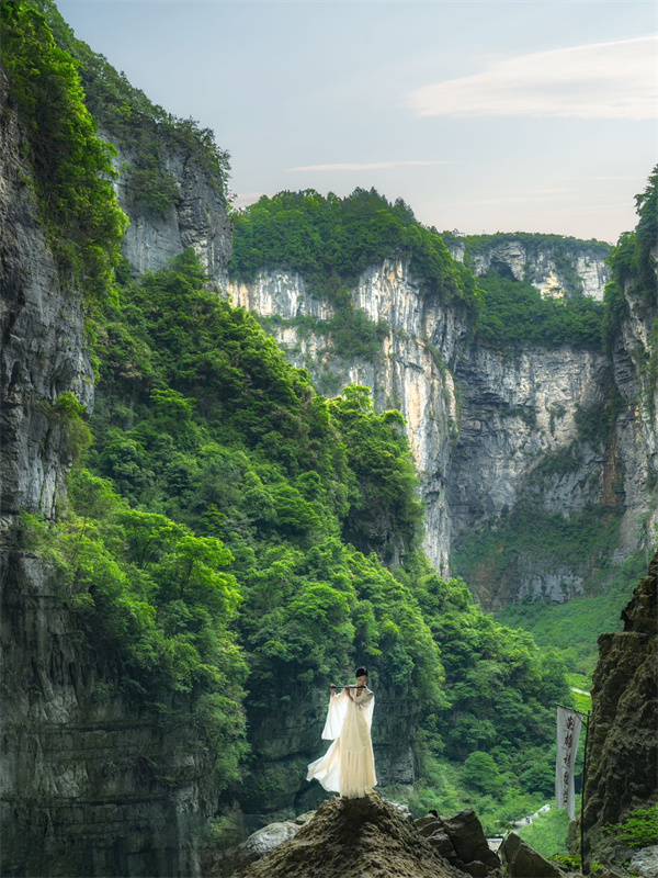 山谷深幽、溪水漫長(zhǎng),俠女眼波流轉(zhuǎn),躺臥于巨石之上,一把油紙傘美醉了天生三橋,將整個(gè)天生三橋點(diǎn)綴得如詩(shī)如畫(huà),在這片江湖之中,你可以感受到一種別樣的自由與暢快。