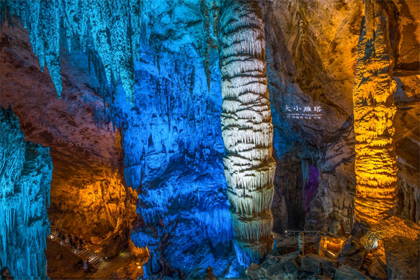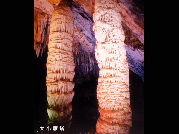 走進(jìn)芙蓉洞,就仿佛踏入了一個(gè)神秘的地下世界。五彩斑斕的燈光照亮了洞內(nèi)形態(tài)各異的石筍、石柱、石瀑布。而其中讓人驚訝的,便是那兩根宛如西安大小雁塔的石筍。它們靜靜地矗立在洞中,中間還蹲著一只形態(tài)逼真的小石獅,不事雕鑿,卻栩栩如生,讓人不得不感嘆大自然的神奇創(chuàng)造力。據(jù)推測,這兩根石筍在芙蓉洞大崩塌前就已經(jīng)形成,距今已有幾十萬年的高齡 ,歷經(jīng)歲月的洗禮,依然保存完好。