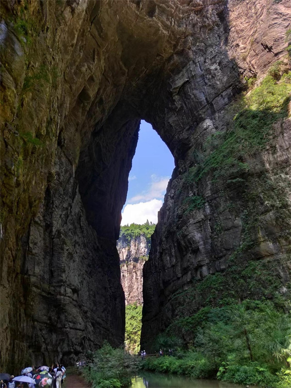 仰頭望去,橋體表面的褶皺如巨龍鱗片,陽光斜切時(shí),明暗交界線會(huì)沿著巖層肌理游走,仿佛一條沉睡的石龍隨時(shí)會(huì)騰空而起。最震撼的是站在坑底仰望,橋涵像人的大拇指,這是大自然在為天生三橋“點(diǎn)贊”呢!