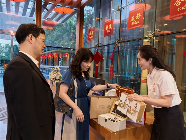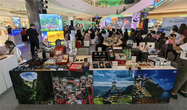 “旅游展臺(tái)”現(xiàn)場(chǎng)鋪設(shè)泰文、英文雙語(yǔ)宣傳冊(cè)及精裝畫冊(cè),詳細(xì)介紹“重慶+武隆”精華線路產(chǎn)品,將“8D魔幻之城”重慶與“世界自然遺產(chǎn)地”武隆完美串聯(lián),勾勒出其獨(dú)特魅力。“非遺展臺(tái)”文創(chuàng)區(qū)則以冰箱貼、折扇等“武隆元素”衍生品傳遞山城詩(shī)意,浩口蠟染以靛藍(lán)扎染演繹“山水入布”,仙女紅氤氳著云霧深處的茶香,武隆非遺柴燒制藝讓非遺之美成為可以攜帶的旅行記憶。