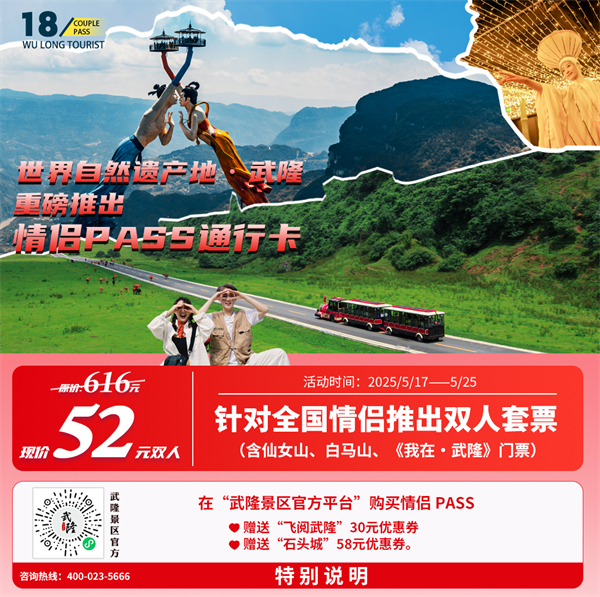 2025年5月17日至25日,情侶Pass甜蜜上線!僅需52元,抱走價(jià)值616元雙人套票!仙女山草原手牽手追日落、白馬山云霧里說情話、《我在武隆》奇幻演出見證誓言,還有驚喜優(yōu)惠券等隱藏福利!這個(gè)“520”,和Ta在世界自然遺產(chǎn)地武隆立下愛情flag,這波儀式感直接拉滿!