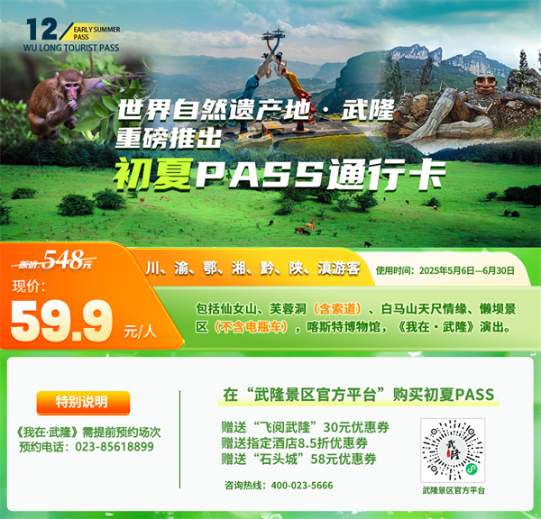 朋友們!五月的快樂密碼找到了嗎?武隆帶著史上最野的Pass卡福利殺來啦!不管你是情侶撒糖、跨省人群、青春活力大學(xué)生,還是深度玩家、本地居民、特定職業(yè)人群,19.9元起解鎖仙女山、天生三橋等頂流景區(qū),隱藏福利更是拉滿,羊毛薅到爽!這波不沖虧到拍大腿,速來查收你的專屬通行證吧!