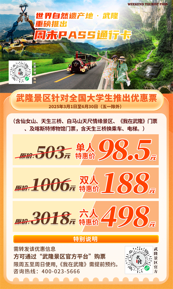 學(xué)生證一亮,折扣低到尖叫!2025年3月1日至6月30日,大學(xué)生周末Pass折扣低至1.7折!單人/雙人/六人套餐隨便挑,六人組團(tuán)最省—每人僅需83元,拿下仙女山+天生三橋(含換乘車、電梯)+白馬山+《我在武隆》演出+喀斯特博物館!周五到周日,甩開書包沖草原,坐電梯穿天生三橋,青春就是要瘋狂省省省+拍拍拍!