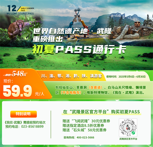 6月30日前,多重pass卡開啟暢游模式,59.9元初夏pass卡解鎖21℃清涼、大學(xué)生周末pass卡火車直達(dá)展開2天1夜短途奇遇、深度游Pass卡躺平式玩轉(zhuǎn)武隆喀斯特秘境。