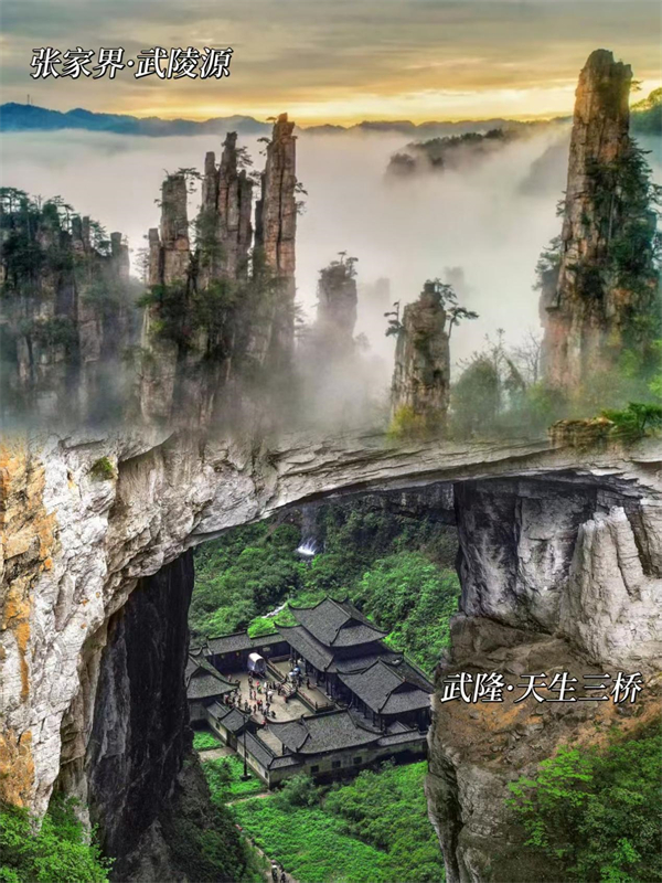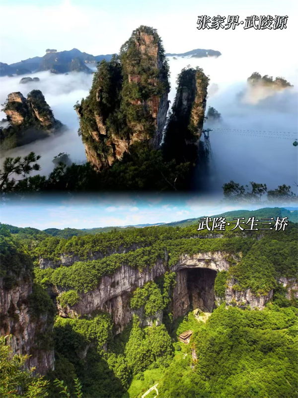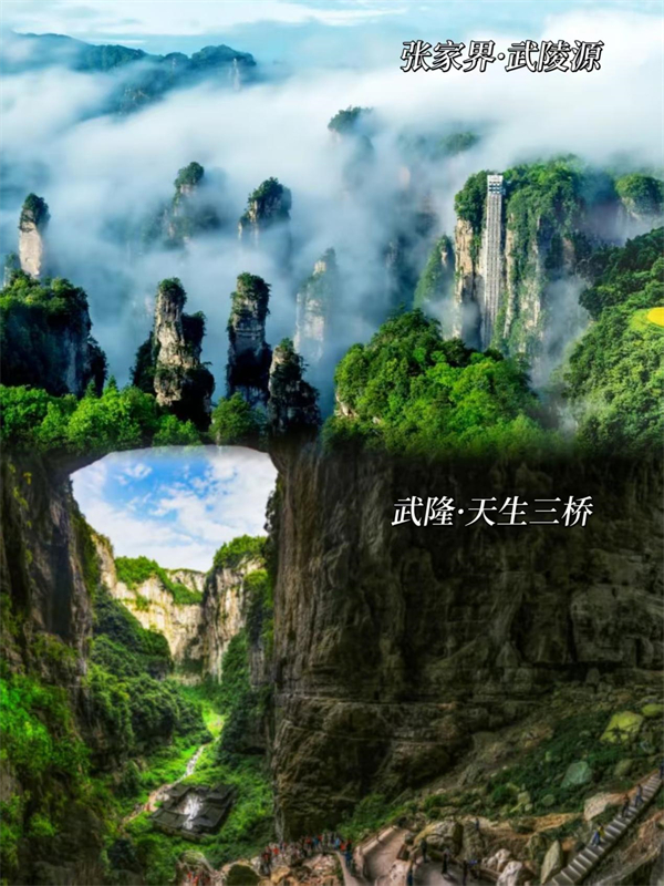 同屬于世界自然遺產(chǎn)地,張家界與武隆都是喀斯特地貌的杰出代表,峰林、峽谷、天坑、溶洞等景觀一應(yīng)俱全。武陵源的奇峰怪石與武隆天生三橋的雄偉石拱,都展示了喀斯特地貌的神奇創(chuàng)造力。
