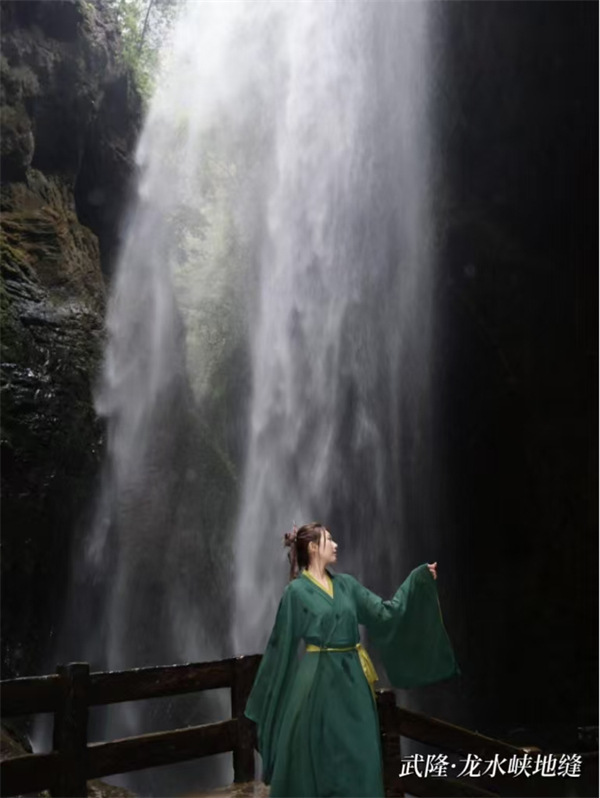 龍水峽地縫幽深神秘,飛瀑流泉,與張家界的地貌景觀相比,多了幾分靈動與婉約。