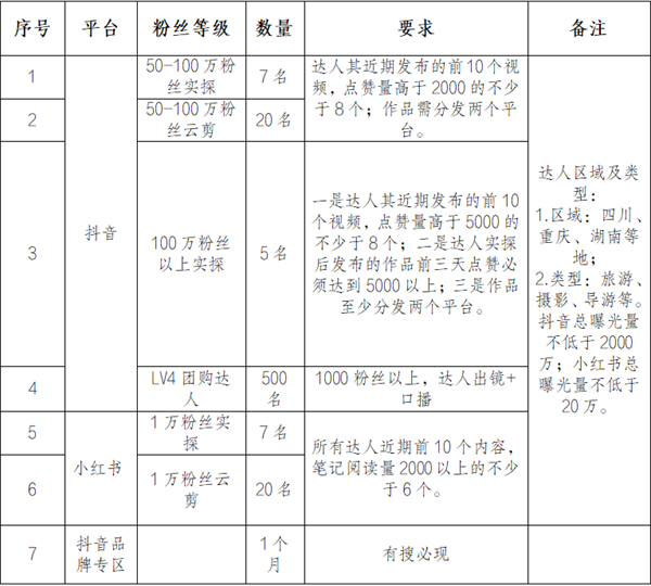 2.本次比選需提交2月13日可赴武隆景區(qū)實(shí)探的達(dá)人資源庫,達(dá)人類型需滿足以下要求:需為攝影、導(dǎo)游、旅游等,不得為營銷類達(dá)人(含探店、美食、汽車、房產(chǎn)等細(xì)分領(lǐng)域);