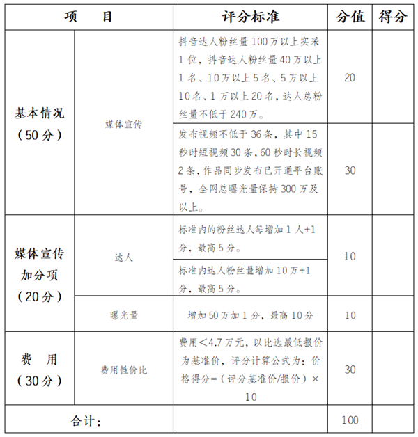 一是抖音達(dá)人粉絲量100萬以上1名并實(shí)采發(fā)布兩條視頻(春節(jié)前后各發(fā)布一次,間隔時(shí)間不低于20天),抖音達(dá)人粉絲量40萬以上1名、10萬以上5名、5萬以上10名1萬以上20名,達(dá)人總粉絲量不低于240萬;二是計(jì)劃發(fā)布視頻36條,15秒時(shí)短視頻30條,60秒時(shí)長視頻2條;三是所選達(dá)人需將作品皆同步發(fā)布全網(wǎng)已開通賬號(hào)的平臺(tái);四是所發(fā)作品全網(wǎng)總曝光量不低于300萬;五是單一達(dá)人單一平臺(tái)只能發(fā)布一條視頻,重復(fù)發(fā)布視頻及流量不計(jì)算視頻條數(shù)及總曝光量(實(shí)采除外)。五是總費(fèi)用不高于4.7萬元。
