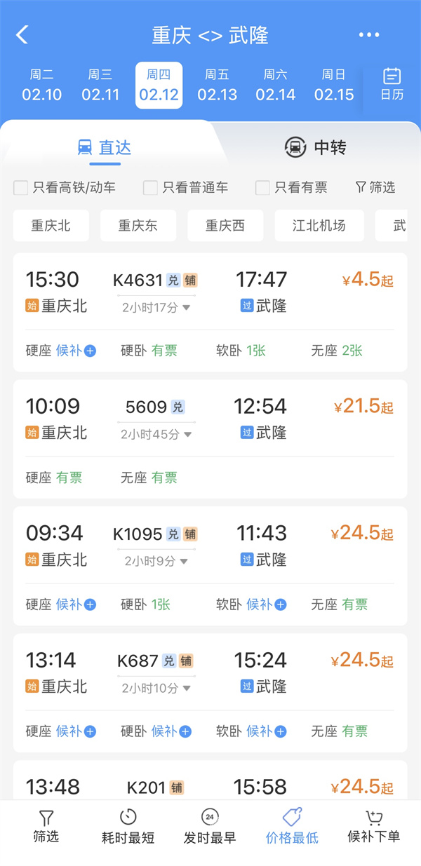 重慶與武隆之間每日有29-30趟班次往返,高鐵最快僅需半小時,二等座票價67元起,火車最低僅需4.5元。不僅出行便捷,更能一卡暢游!