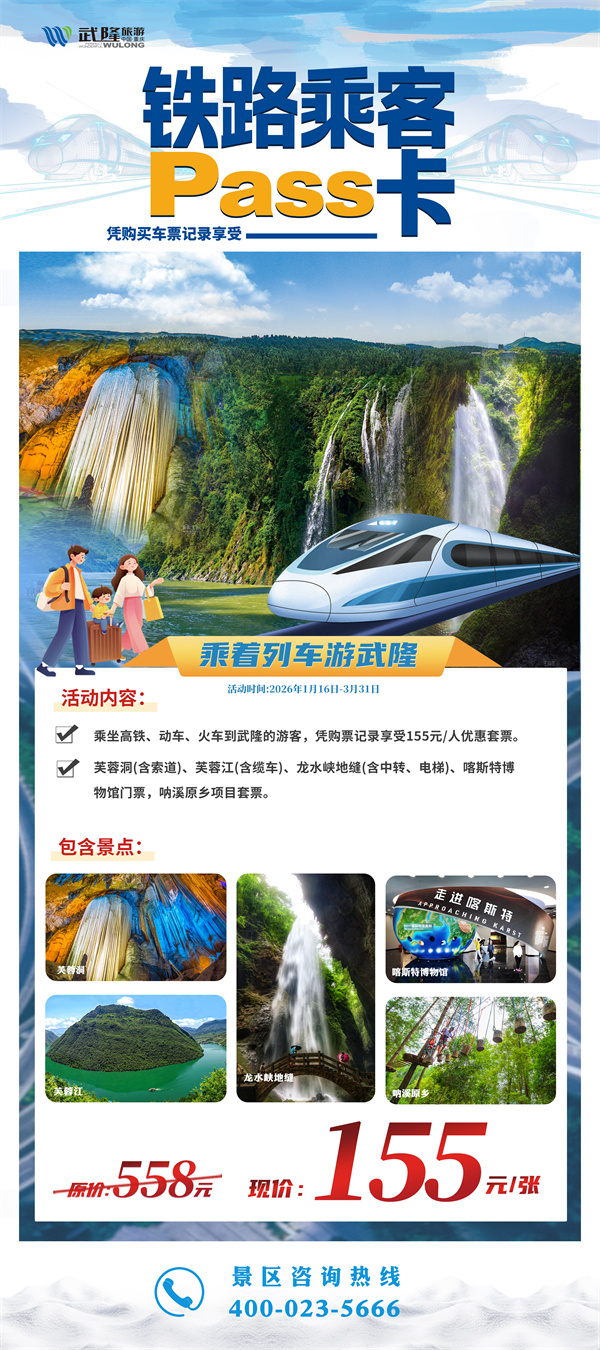 武隆景區(qū)為乘坐高鐵、動車、火車前來的游客送上超值福利——鐵路乘客Pass卡!1月16日至3月31日,僅需155元,五大王牌景區(qū)任你撒歡,讓你的旅途從“趕路”變成“玩路”!